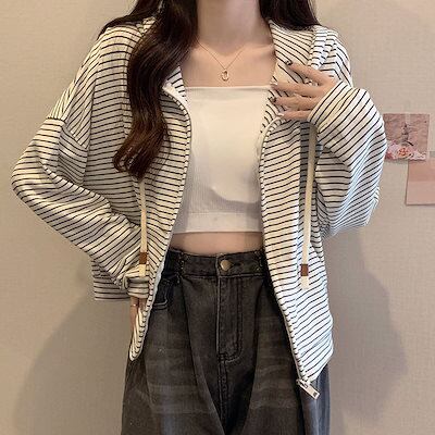 カーディガン パーカー ストライプ 長袖 スウェット レディース 春秋 薄手 韓版 ゆったり 怠惰な風 ファスナー アウター