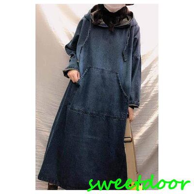 デニムワンピース ワンピース レディース デニムワンピ パーカーワンピース マキシワンピー 長袖 ロングワンピース プルオーバー マキシ丈 Aラインワンピース
