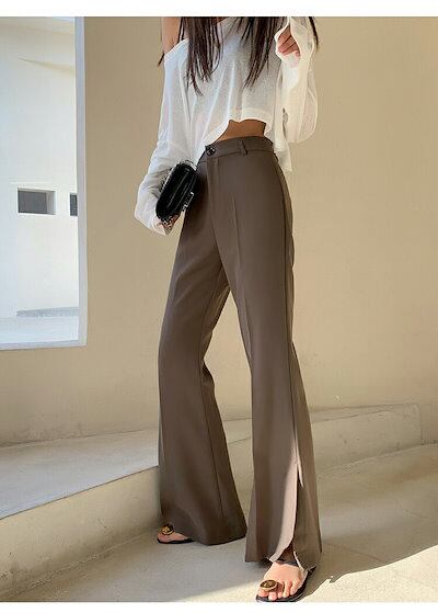 フレア スリット パンツ レディース きれいめ セミフレアパンツ 黒 ブラウン カジュアル スリットパンツ 美脚 脚長 ハイウェスト ボトムス ロングパンツ 長ズボン ベルトホーク セミワイドパンツ | gizshop