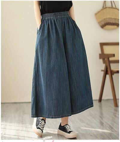 デニムパンツ ワイドパンツ レディース デニム パンツ ウエストゴム ロング丈 無地 ガウチョパンツ タック ポケット付き ボトムス 体型カバー スカーチョ ゆったり ロングパンツ フレア カジュアル | gizshop