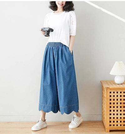 デニムパンツ ワイドパンツ レディース デニム パンツ ウエストゴム 9分丈 無地 ガウチョパンツ タック ポケット付き ボトムス 体型カバー スカーチョ ゆったり ロングパンツ フレア カジュアル | gizshop