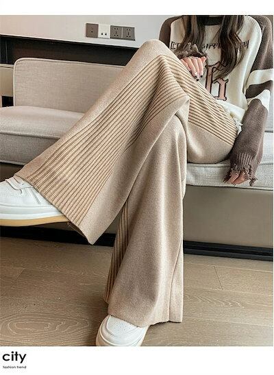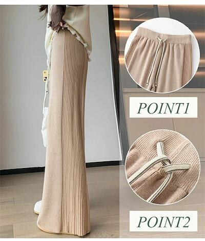 ワイドパンツ 秋冬 ガウチョパンツ パンツ レディース ロングパンツ フレアパンツ ニット パンツ ニットパンツ ロング丈 秋物 ウェストゴム 体型カバー リボン付き ニットワイドパンツ 長ズボン ガ | gizshop