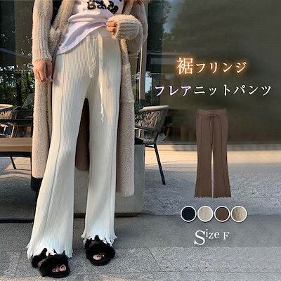 裾フリンジ フレア ニットパンツ レディース フレア ニット パンツ 秋冬 イージーパンツ ロングパンツ 秋 冬 春 ロング リブニット フレアパンツ リラックスパンツ ボトムス 体型カバー 美脚 通 | gizshop