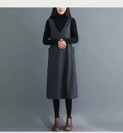 ジャパンスカート レディース ツイード ワンピース 裏起毛 厚手 春 秋 冬 Vネック ロング丈 ジャンスカ ジャンパースカート ツイード ベスト ワンピース 重ね着 レイヤード 体型カバー 可愛い | gizshop