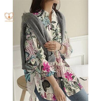 シャツ シャツブラウス ブラウス トップス 前開き レディース ロング丈 長袖 折り襟 花柄 柄 プリント 綿麻 通気性 大きいサイズ 春 30代