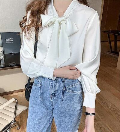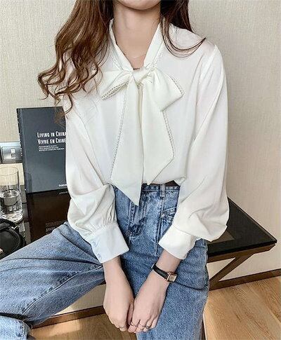 ブラウスレディースシャツインナートップススーツインナービジネススーツ白シャツ秋ボウタイカラー長袖ボウタイリボンリボンタイボウタイリボンオフィスカジュアルフォーマル体型カバー小顔効果大きいサイズ通勤お呼 | gizshop