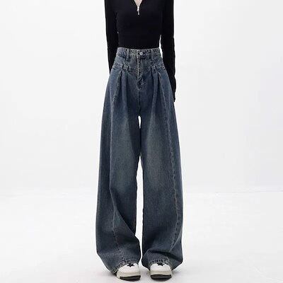 デニムワイドパンツ レディース デニム ワイド パンツ タックパンツ ロング丈 ジーンズ デニムパンツ ボトムス ハイウエスト リラックス ジーパン バギーパンツ ゆったり おしゃれ 体型カバー 着痩 | gizshop