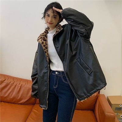 PU レザージャケット 冬新しい 厚手 ヒョウ柄 トップス レディースファッション 裏起毛 中綿コート アウター 両面着用