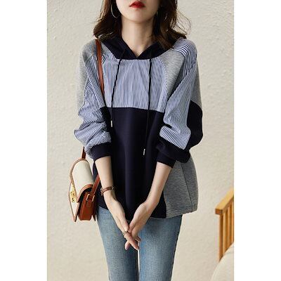 スウェットパーカー トップス レディース 秋服 長袖プルオーバー パーカー フード付き 配色 ストライプ柄 ジャージ 韓国風 ゆったりTシャツ 40代カジュアル