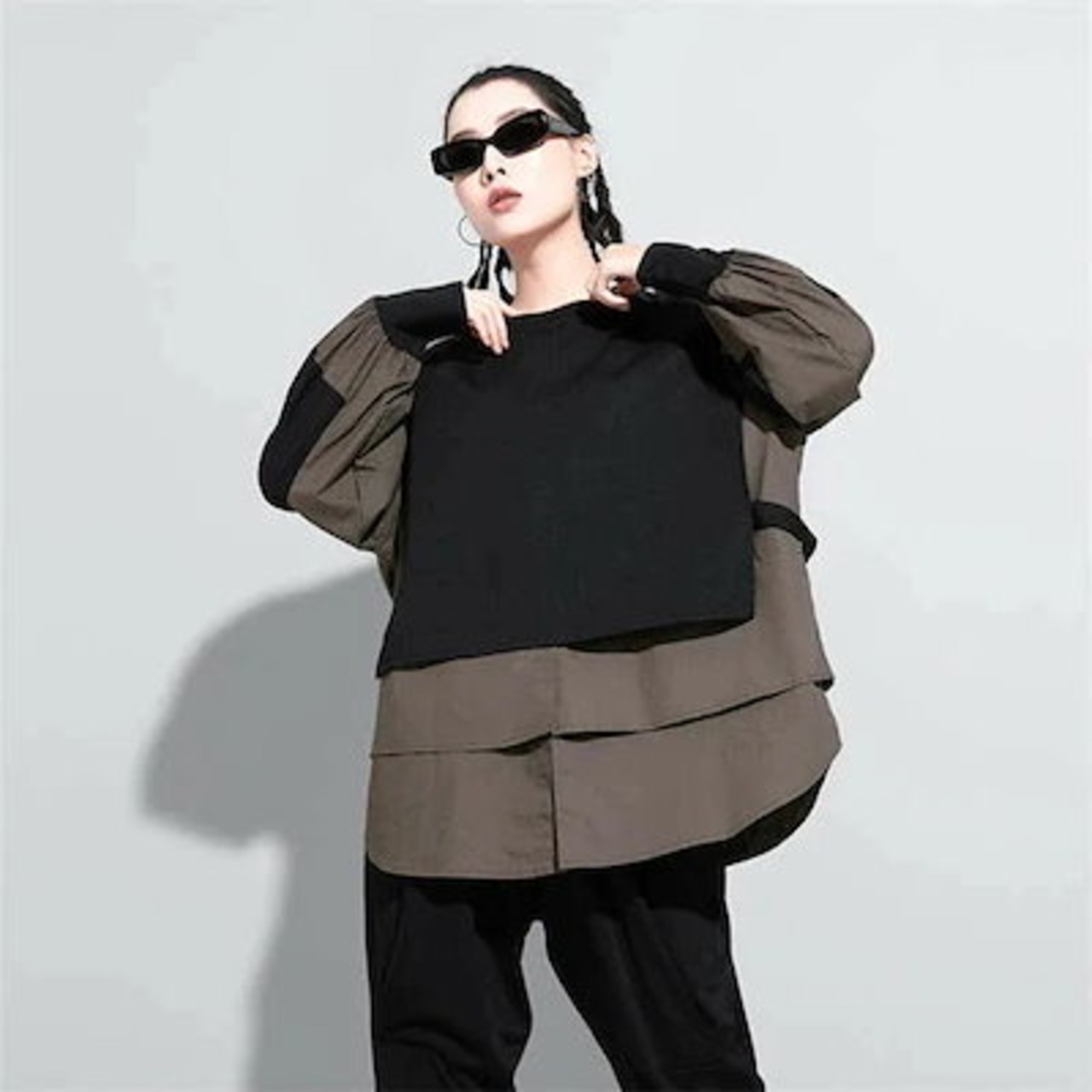 パーカー レディース 異素材レイヤード風トップス スウェット レディース 長袖 モード系 個性的 スウェット トレーナー プルオーバー トップス ドッキング フェイクレイヤード 重ね着風 無地 大人
