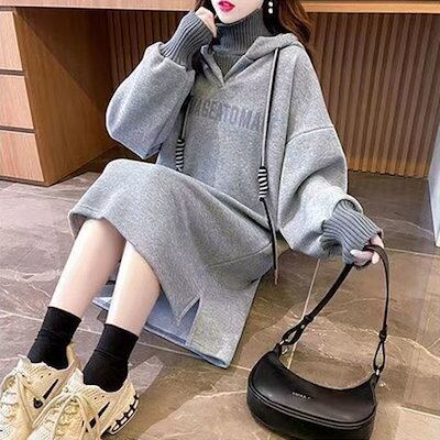 レディースパーカー ファッションカップル 長袖 裏起毛 フェイクレイヤード 暖かい スウェット 大きいサイズ ワンピース 可愛い? スウェット トレーナー 韓国