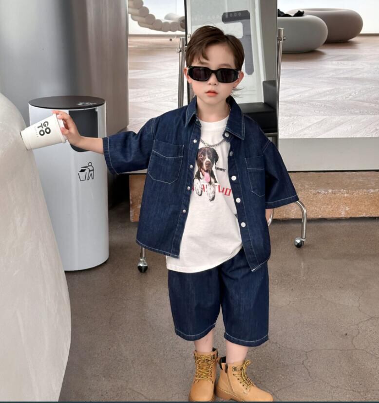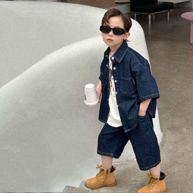 【2点セット】2023春夏新作★子供服★ベビー服 ★キッズ服 ★デニム 半袖 シャツ+ショットパンツ