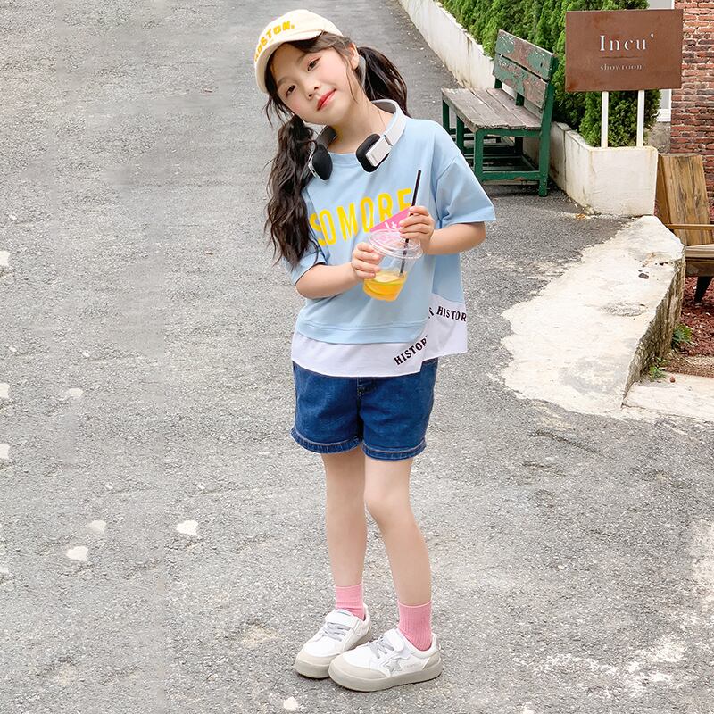 女の子、夏、韓国風子供服、オデルTシャツ、半袖、ジーンズ、ショートパンツ