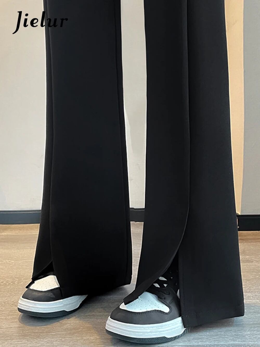 Jielur-女性用のモノクロスプリットハイウエストパンツ、女性用オフィススーツ、シックなジッパー、シンプルでカジュアル、アプリコット、ブラック y2k ボトムス T240901122904_01 | gizshop