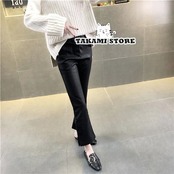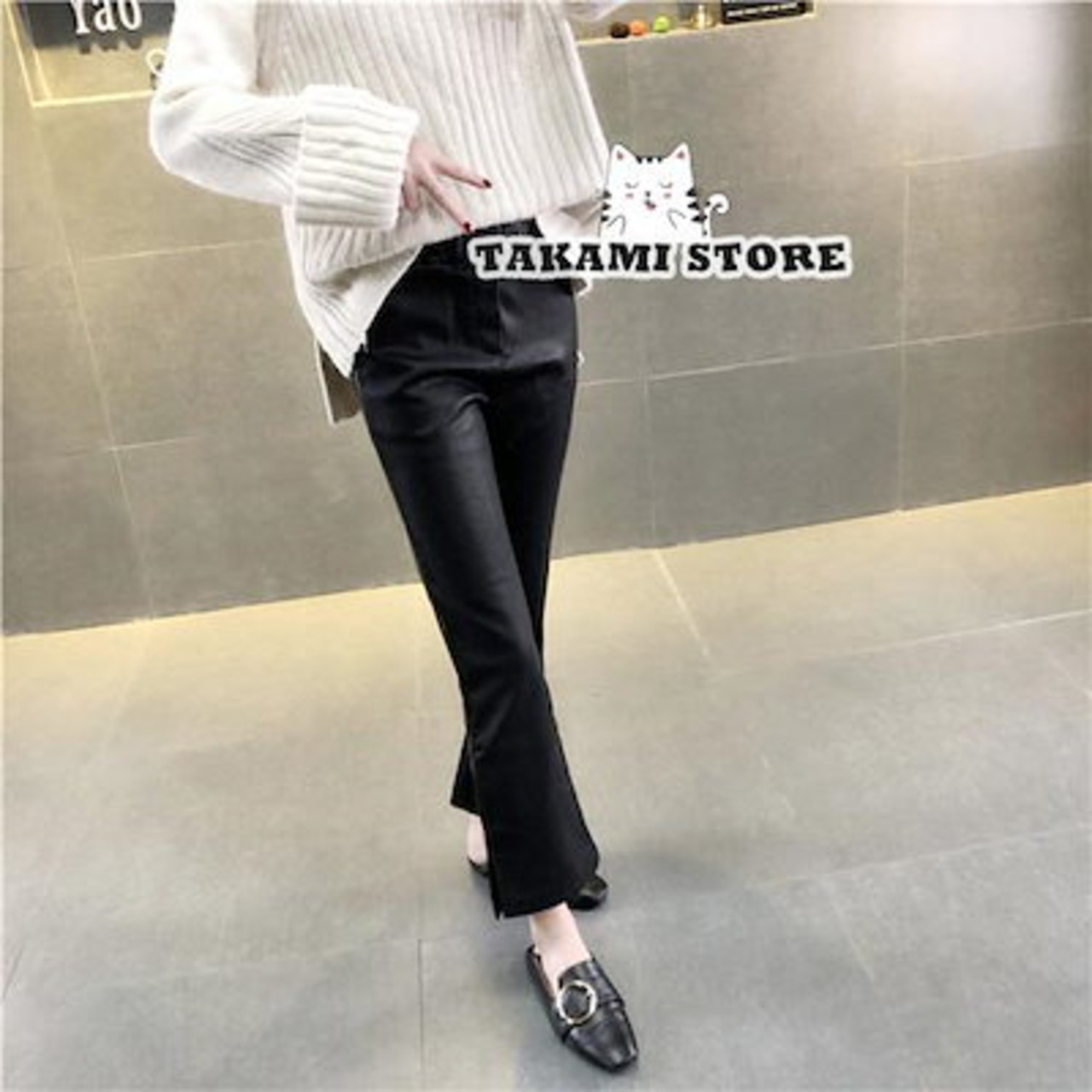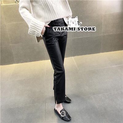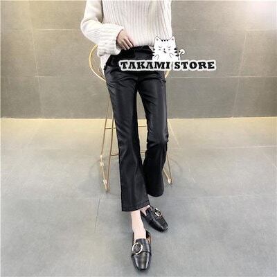 人気商品超目玉 レザースパンツ レディース ガウチョパンツ スリット ウエストゴム PU 九分丈 フレア ハイウエスト 合皮 フェイクレザー 革パン 美脚 秋 冬
