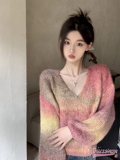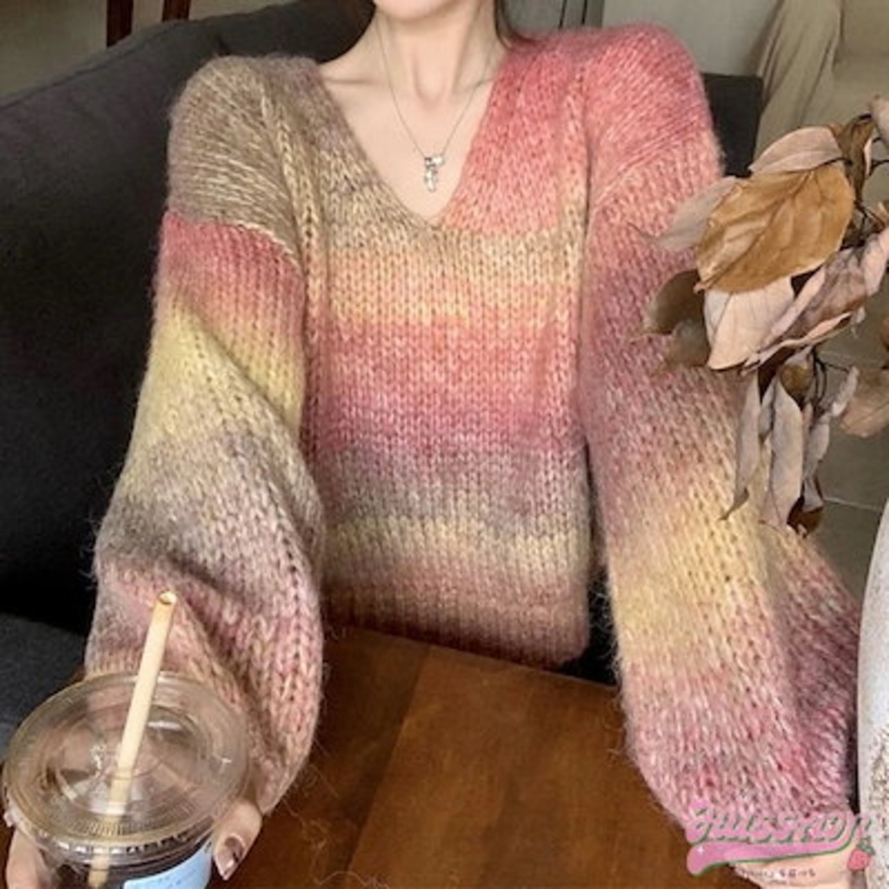 韓国ファッション ベーシックニット トップス ニット セーター ボーダー もこもこ 長袖 ゆったり Vネック レッド 赤 イエロー 黄色 秋 韓国ファッション レディース おしゃれ | gizshop