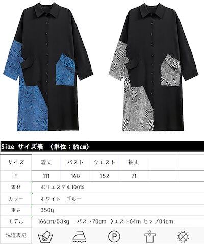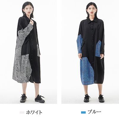 配色ロングシャツワンピ シャツワンピース ロング レディース 春 ロングワンピース 長袖 ドルマン袖 ロング丈 羽織り 襟付き トップス プリント アシンメトリー 落ち感 大人 モード系 体型 | gizshop