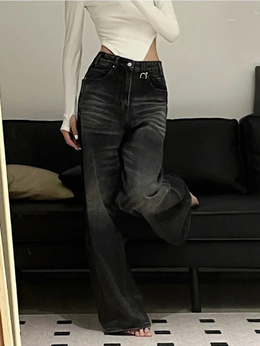 "Houzhou-女性用ブラックワイドレッグジーンズ,ヴィンテージブラックワイドレッグ,ラージサイズ,韓国ファッション,バギー,grunge y2k,ヒップホップスタイル ボトム ワイドレッグ バギーパンツ T240831173404_01 | gizshop