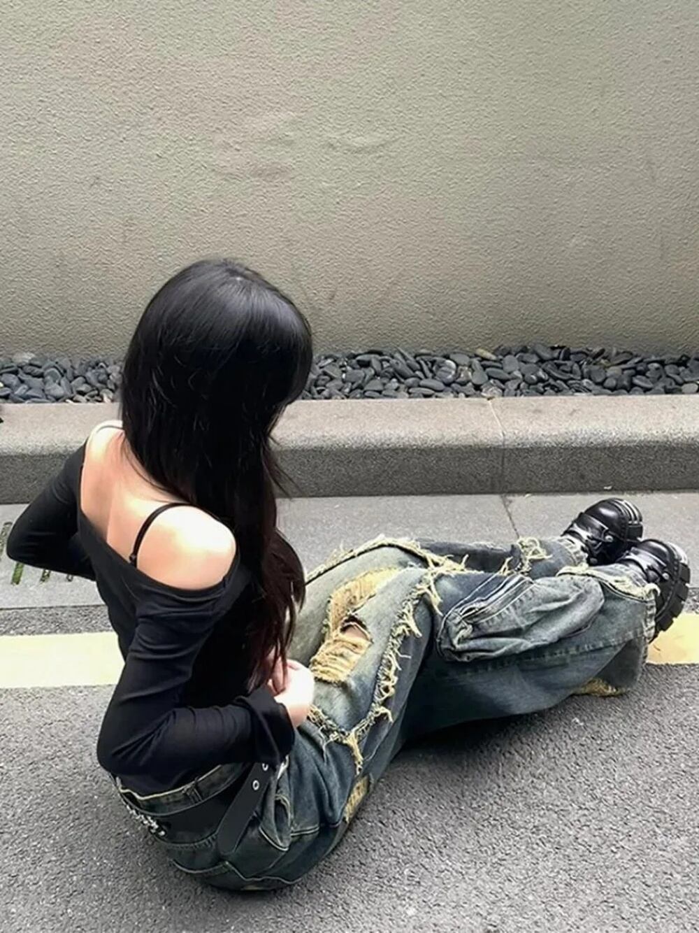 女性用のウォッシュドタッセル付きの色あせたバギージーンズ,ハイウエスト,ワイドレッグ,ルーズフィット,古いファッション,レトロなストリートヒップホップ,カジュアル,y2k ボトム ワイドレッグ バギーパンツ T240831173613_01 | gizshop