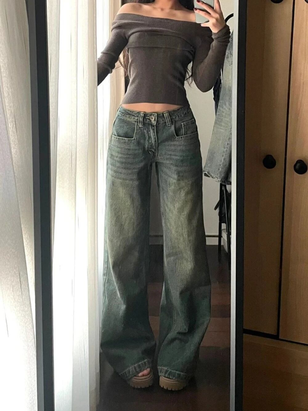 広州-レディースヴィンテージバギージーンズ、ウォッシュドカジュアルパンツ、ハイウエスト、ルーズデニムパンツ、ワイドレッグパンツ、韓国ストリートウェア、y2k ボトム ワイドレッグ バギーパンツ T240831173637_01 | gizshop
