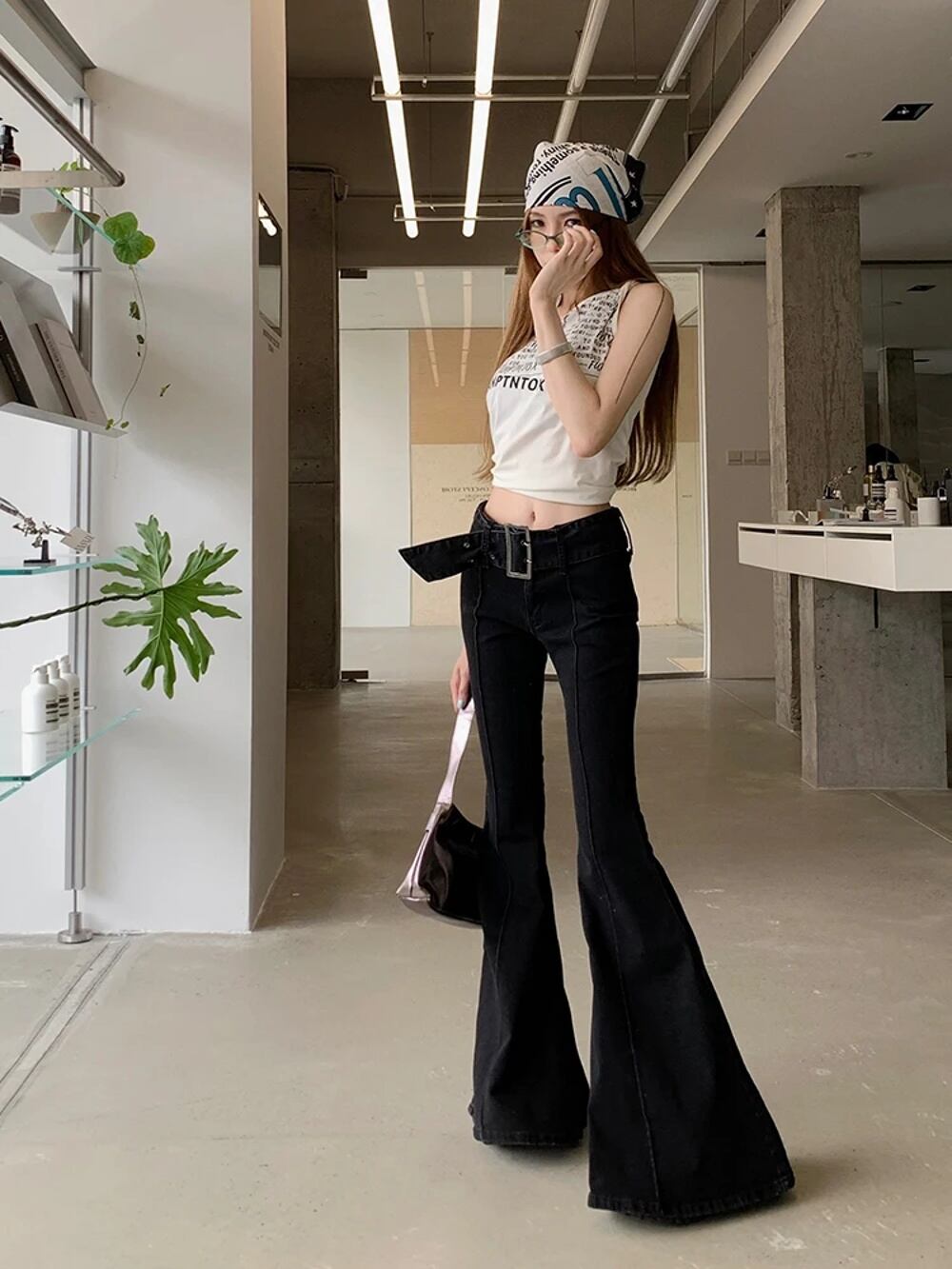 女性のためのアメリカンレトロフレアジーンズ、ローウエスト、e-girl、スリムバンデージ、ブラックコットンデニムパンツ、ハイストリートファッション、y2k ボトム ワイドレッグ バギーパンツ T240831173646_01 | gizshop
