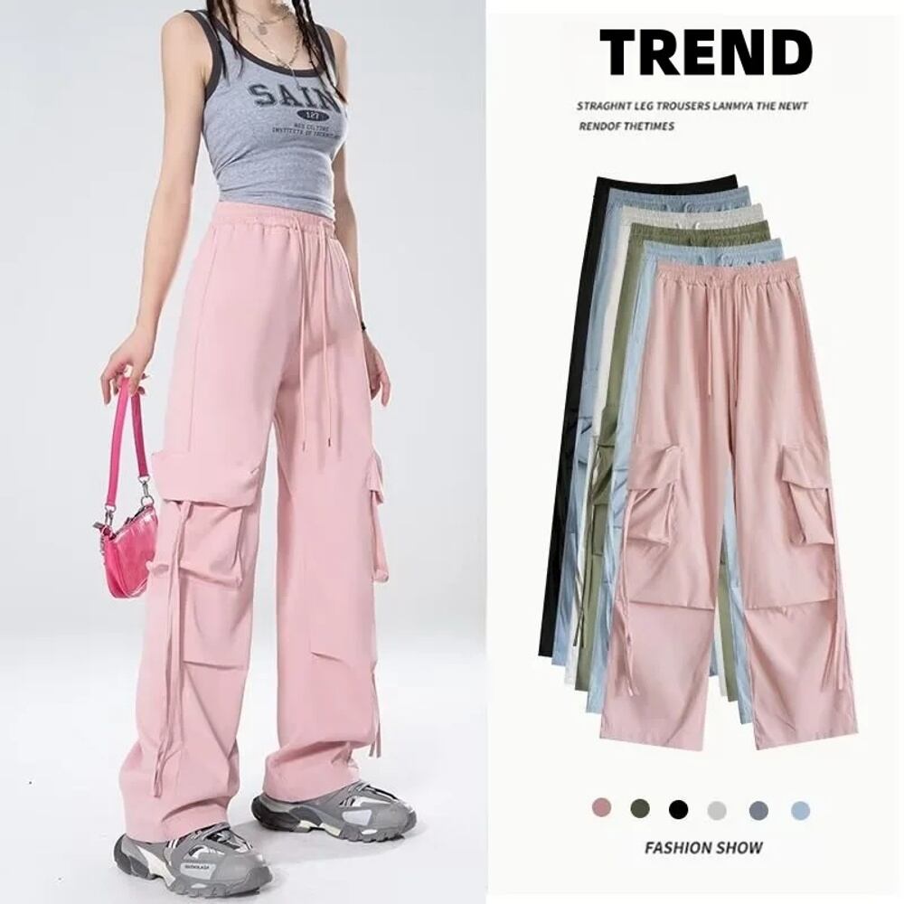女性のヒップホップカーゴパンツ,カジュアルなストリートウェア,ハイウエスト,大きなポケットのパンツ,ドローストリングのバギー,ワイドレッグ,夏 ボトム ワイドレッグ バギーパンツ T240831222645_03 | gizshop