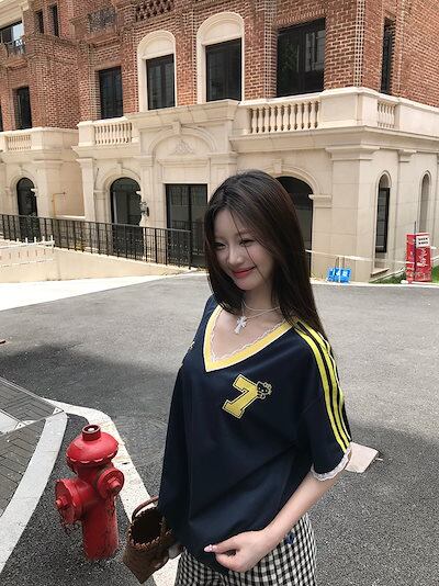 2024夏 韓国可愛い風トップス Tシャツ ファッション 半袖 スリムフィット ロングサイド ペイントシルエット ゆったり丈 休日レディースサイズ韓国Vネック おしゃれ カジュアル メンズライク T | gizshop