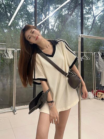 2024夏 韓国トップス ポロシャツ 半袖 Vネック ストライプ ゆったり 細見え 夏 白 おしゃれ かわいい 韓国ファッション レディース お出かけ
