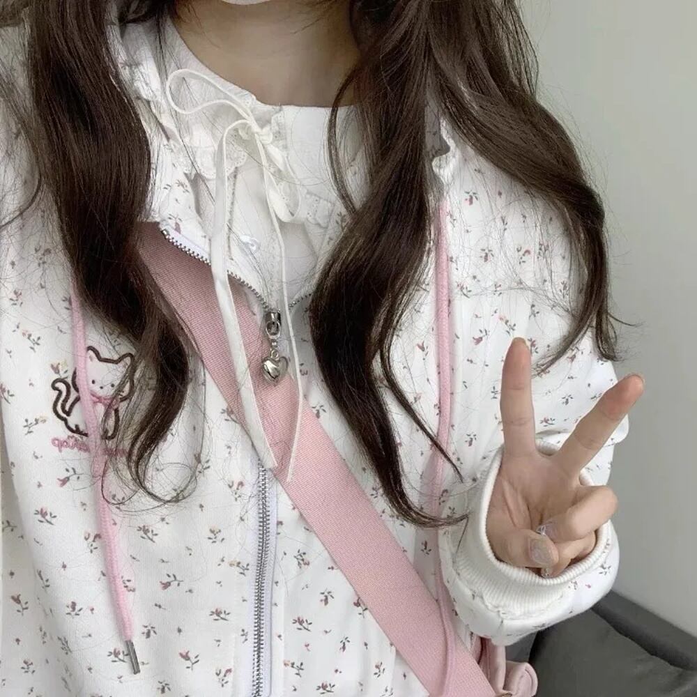 女性用和風フローラルフーディージャケット、y2k、e-girl、長袖、ジッパーカーディガン、ルーズコート、ミッドレングススウェットシャツ、かわいいコート、新しい、2024 パーカー ジャージ y2k T240908141609_01 | gizshop