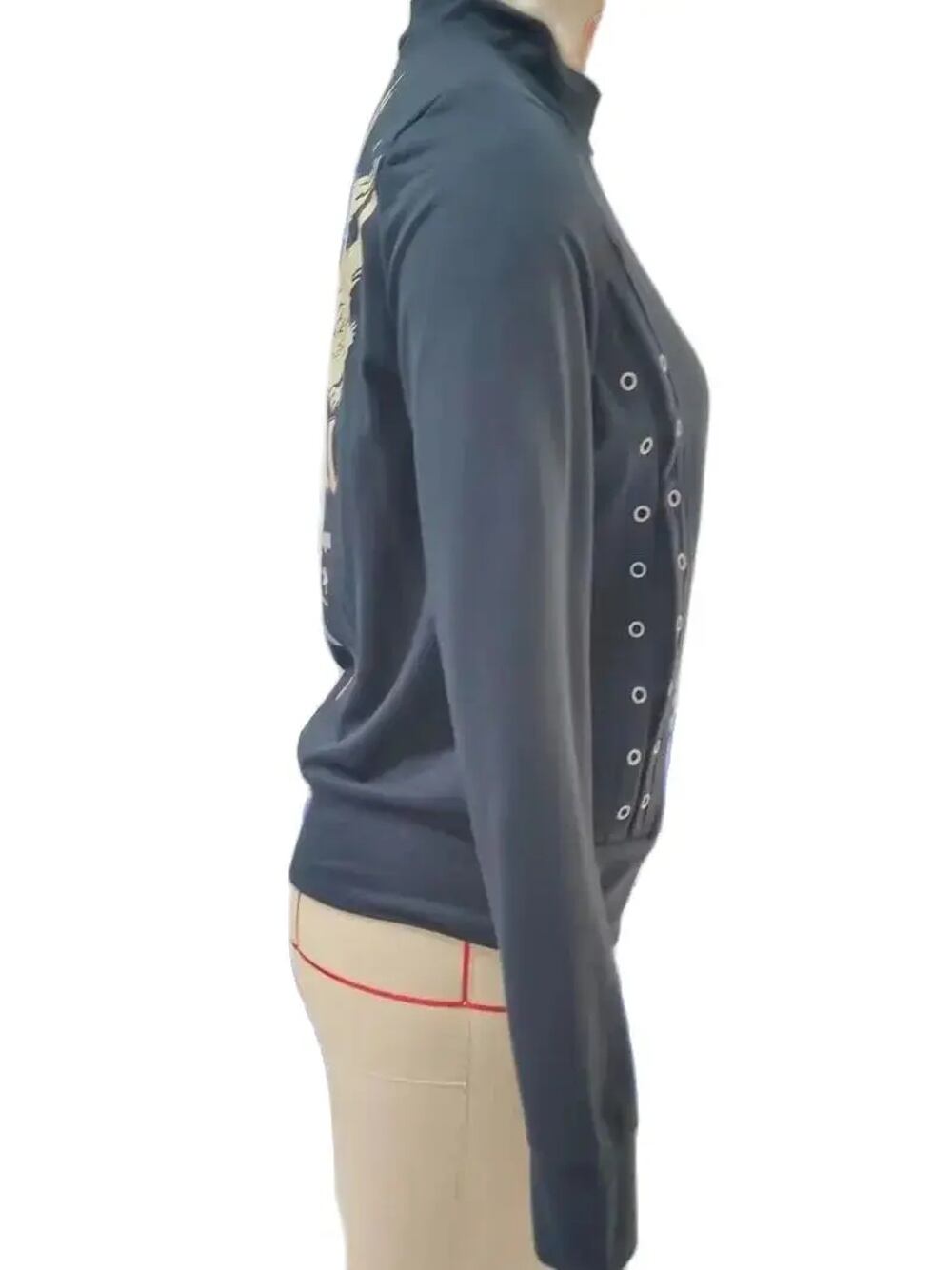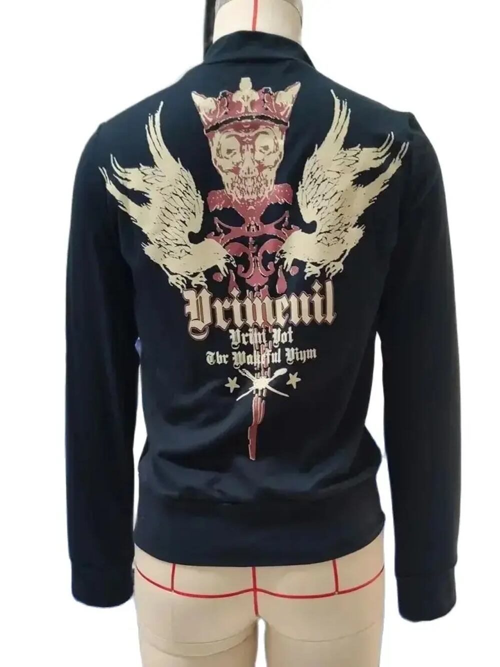 女性のスカルとレタリングプリントのパーカー、サイドタイアップ、長袖、ジップアップ、ブラック、ベーシック、スリムスウェットシャツ、カジュアル、y2k、ファッション パーカー ジャージ y2k T240908164341_01 | gizshop